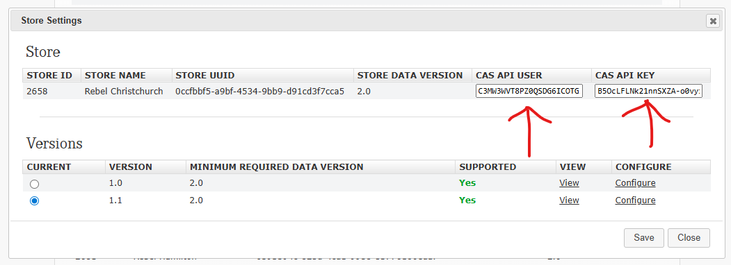 | Make sure it has the CAS API USER and CAS API KEY these are found here . . . NZESL Technical Hub - Customers & Groups on CAS Select latest version and hit save. | ![]() |